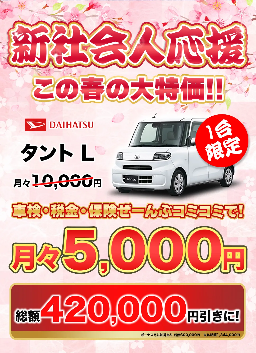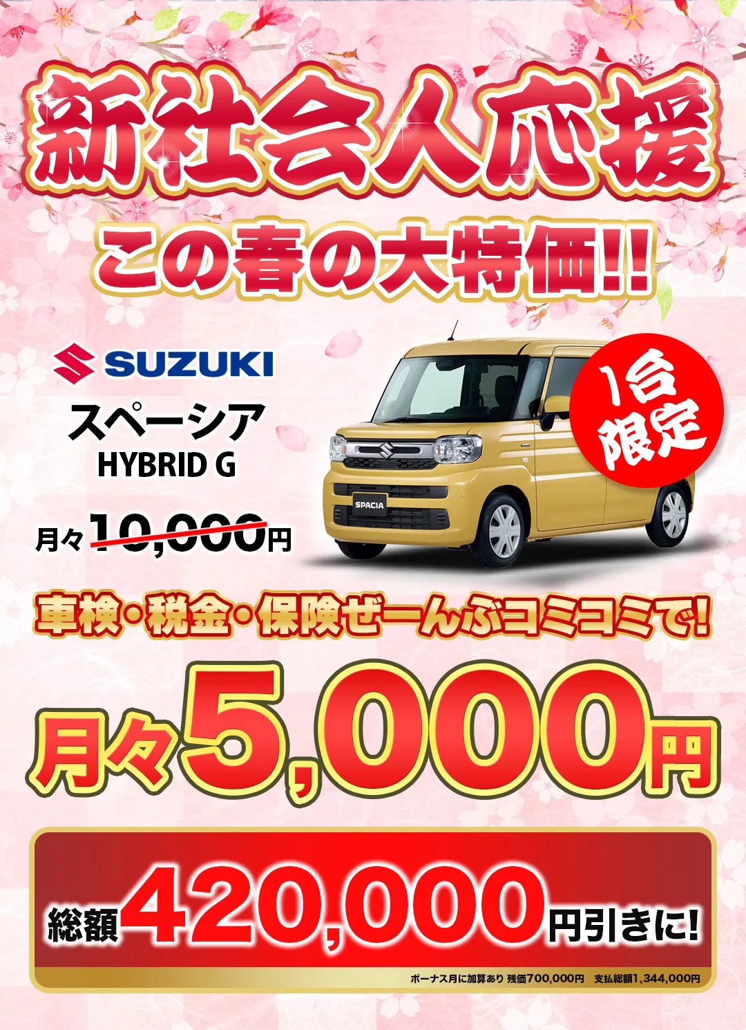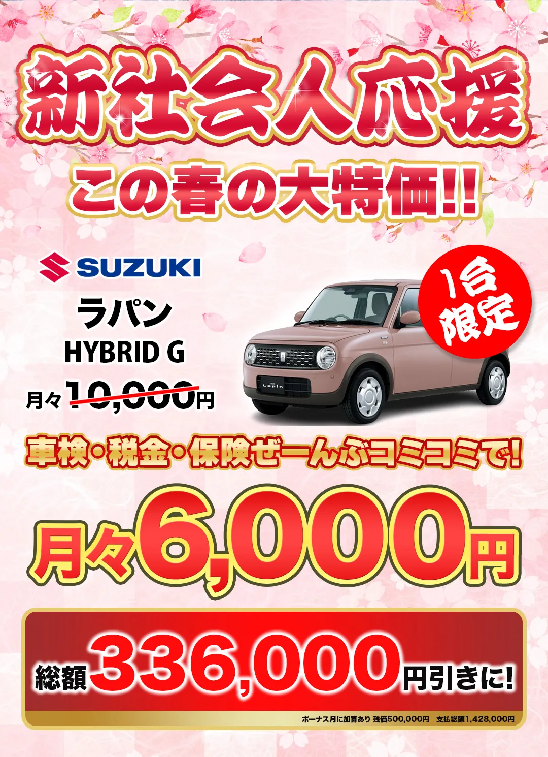 契約期間中の税金やメンテナンス費用が含まれている為、ローンなどと比較すると割高ですが、リースは残価を設定しますのでその分が差し引かれます。そのため実際の月々は割高にはなりません。設定残価はリースアップ時の売却予定価格ですので、月々払いでは、人気車種に絞って高い残価を設定しました。だから、安い月々払いが実現出来ているんです!