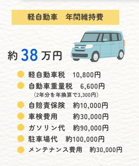 例えば、ホンダのN-BOX(2WD)を年間1万km走行、駐車場代が月額8,000円と仮定した場合、年間の維持費は約38万円が目安となります。