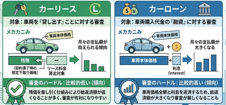 カーローンは車両購入代金の「融資」に対する審査ですが、カーリースは車両を「貸し出す」ことに対する審査です。