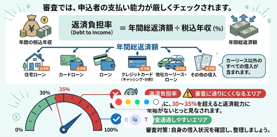 この返済負担率には、住宅ローンやカードローンなど、カーリース以外の借入も含まれます。