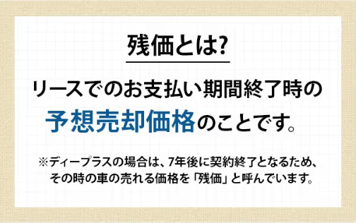 「残価」とは、契約満了時の車の予想下取り価格のことで、月々のリース料はこの残価を車両価格から差し引いて算出します。