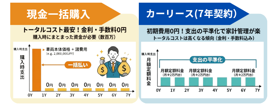 新車を現金一括で購入する場合と、カーリースで7年契約を結ぶ場合では、費用の支払い構造が根本から異なります。
