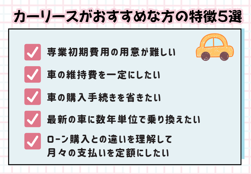 これまでの内容を踏まえ、どのような方にカーリースが向いているのか、具体的な特徴を5つ紹介します。
