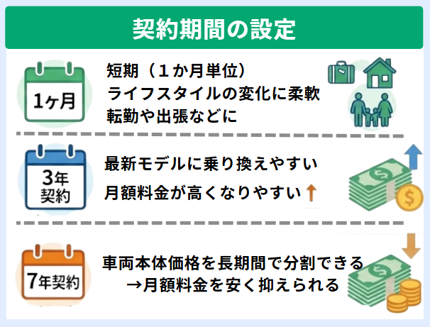 カーリースは3年、5年、7年といった契約期間を定めて利用するサービスです。
