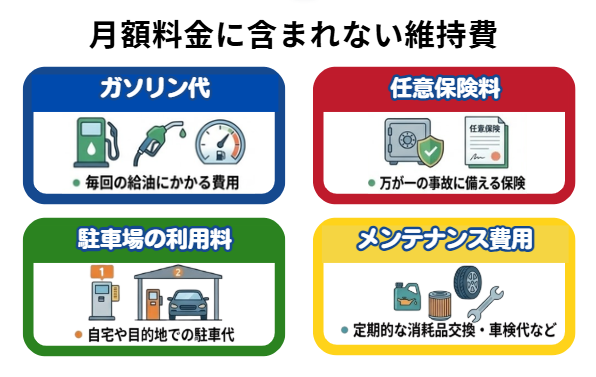 ただし、ガソリン代や駐車場代、任意保険料など、月額料金には含まれず自己負担となる費用も存在します。