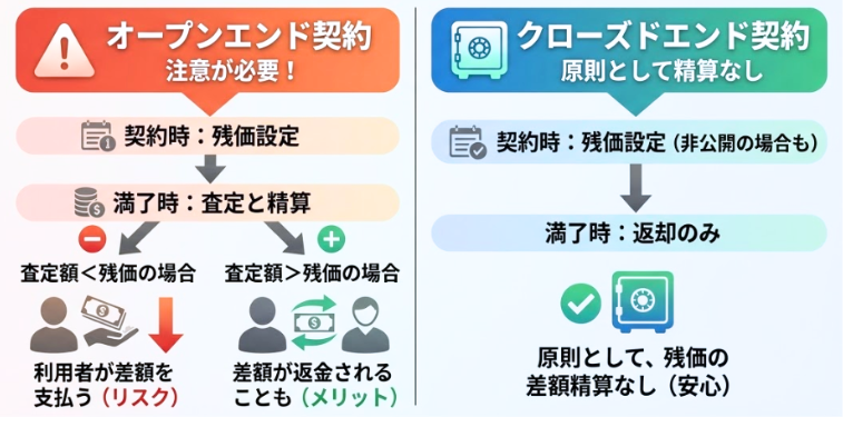 一方、クローズドエンド契約では、原則として残価の差額精算は発生しません。
