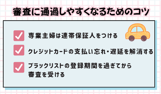 収入がない、あるいはブラックリストに該当する方が審査に通過しやすくなるためのコツは3つあります。