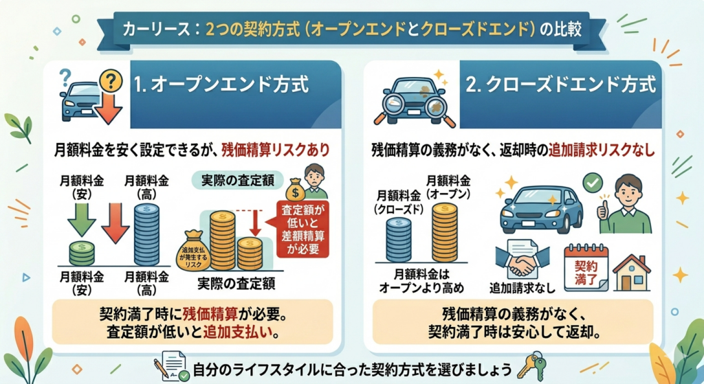 オープンエンド方式は月額料金を安く設定できますが、契約満了時に残価精算が必要で、査定額によっては追加支払いが発生するリスクがあります。