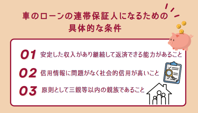 連帯保証人になるための最も重要な条件は、契約者が返済できなくなった場合に代わって返済を継続できる、安定した収入があることです。