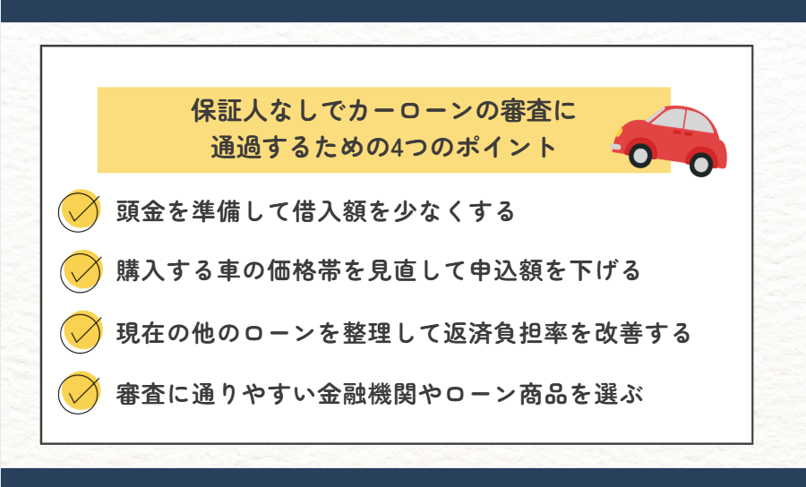 保証人なしでカーローンの審査に通過するための4つのポイント
