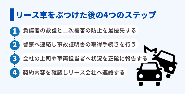 やるべきことは、負傷者の救護と安全確保、警察への連絡、会社とリース会社への報告です。