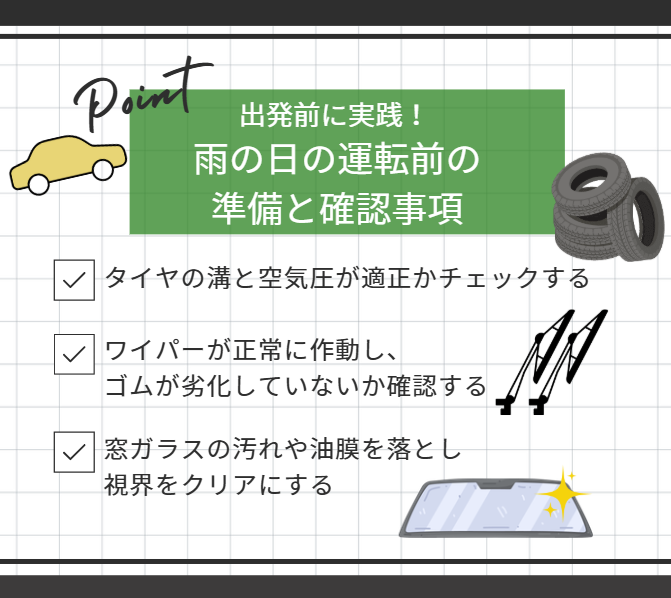 安全を確保するためには、まず出発前にタイヤの溝や空気圧、ワイパーの状態、窓ガラスの汚れなどを確認する習慣が不可欠です。