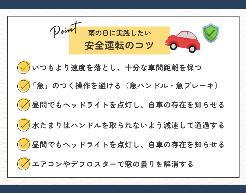 安全を確保するためには、運転中の操作や心がけも晴天時とは変える必要があります。
