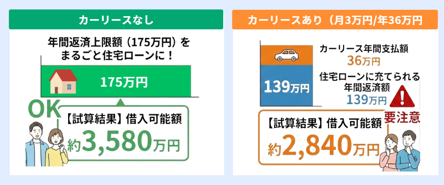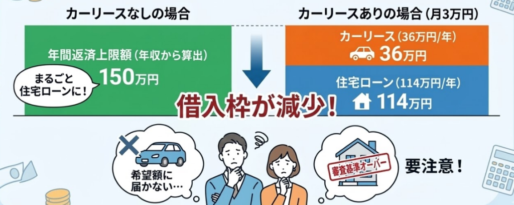 このように、カーリースの支払いが存在する分だけ、住宅ローンとして借り入れられる枠が直接的に圧迫される仕組みです。