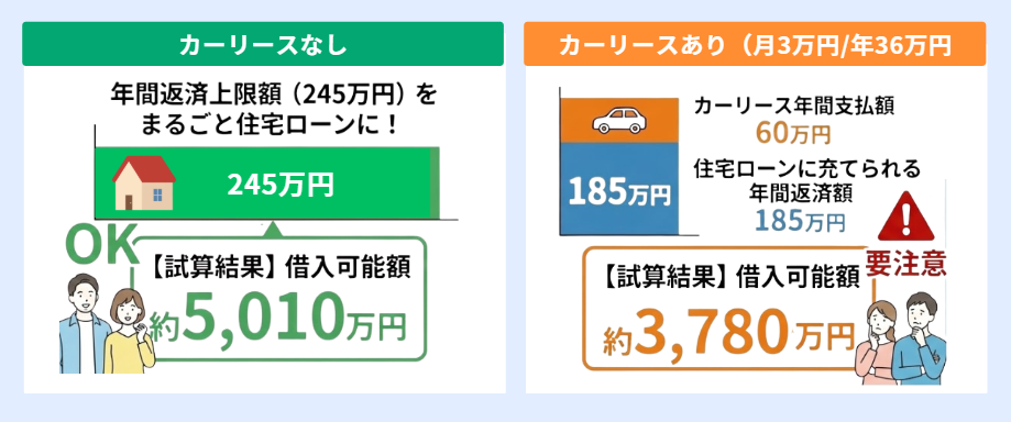 一方、カーリース契約があると借入可能額は約3,780万円となり、約1,230万円もの差が生じます。