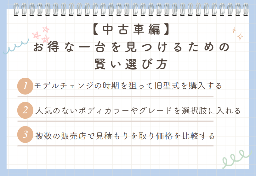 中古車を選ぶ際には、モデルチェンジ後の旧型式を狙ったり、人気色や上位グレードを避けたりすることで割安な車両を見つけやすくなります。