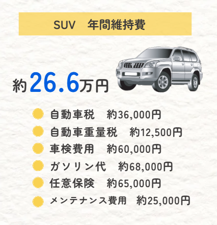 コンパクトカーよりはやや高くなりますが、燃費性能の高さからガソリン車SUVと比較すると維持費は抑えられます。