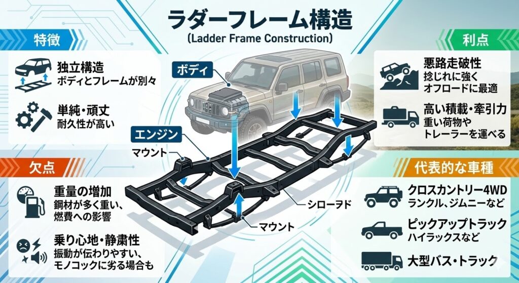 これは、はしご(ラダー)状の頑丈な鋼鉄製フレームの上にエンジンやサスペンション、そして車体を載せる構造で、本格的なクロスカントリー車やトラックに採用されています。