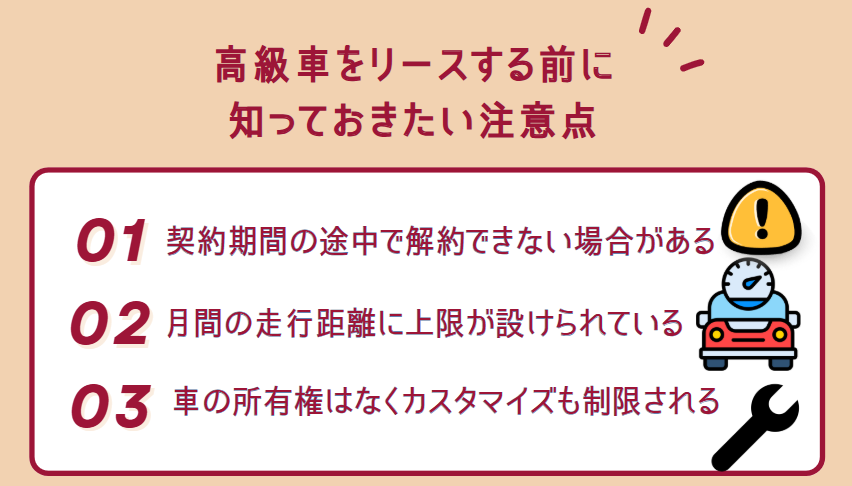 高級車のリース契約は、初期費用を抑えられるなどのメリットがある一方で、契約前に理解しておくべき注意点も存在します。