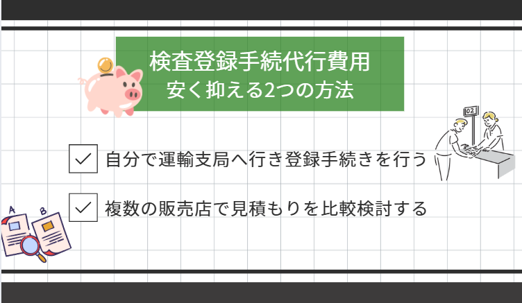 費用を抑えるには、自分で運輸支局へ出向いて手続きを行うか、複数の販売店から見積もりを取得して比較検討する方法が有効です。