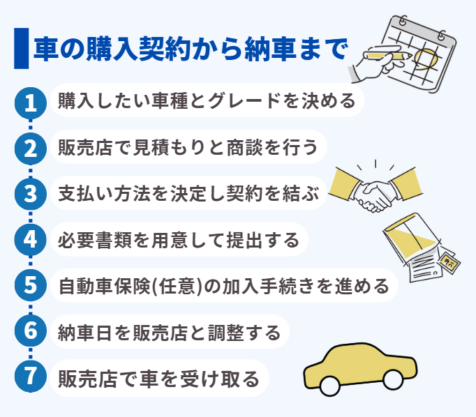 車の購入を決定してから実際に納車されるまでには、いくつかの手続きを踏む必要があります。