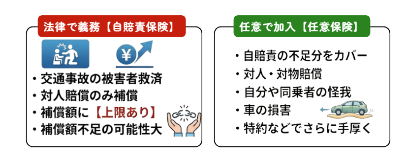 車の保険には、法律で加入が義務付けられている「自賠責保険」と、任意で加入する「任意保険」の2種類があります。