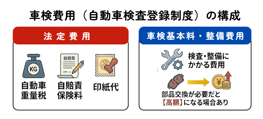 車検費用は、法律で定められた「法定費用(自動車重量税、自賠責保険料、印紙代)」と、検査や整備にかかる「車検基本料・整備費用」で構成されます。