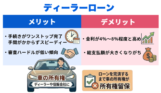 また、ローンを完済するまで車の所有権がディーラーや信販会社に留保される「所有権留保」が付くのが一般的です。