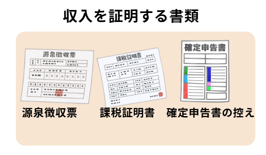 申込時には、収入を証明する書類として、源泉徴収票や課税証明書、確定申告書の控えなどを求められます。