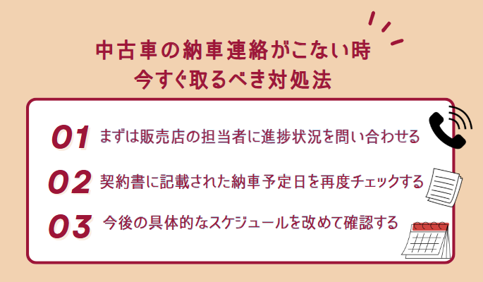 ここでは、納車連絡が来ない際に、購入者が今すぐ取るべき具体的な対処法を解説します。