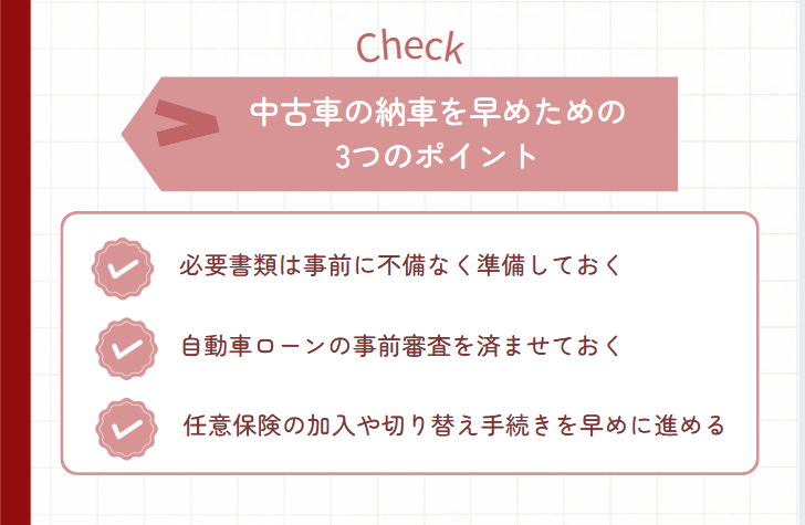 ここでは、購入者側で実践できる、中古車の納車を早めるための3つのポイントを紹介します。