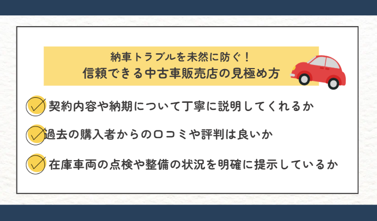 納車連絡が来ないといったトラブルは、契約前の販売店選びの段階である程度回避できる可能性があります。